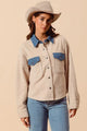 Stay cozy and stylish in this Faux Sherpa Fur Shacket With Denim Collar. The faux sherpa fur material offers warmth and comfort, perfect for colder days. The denim collar adds a unique and trendy touch to this shacket style. Versatile and chic, you can easily layer it over your favorite outfits for added warmth and style. Elevate your outerwear game with this fashionable and functional piece.