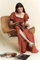 This enchanting maxi dress combines vintage charm with modern comfort. Crafted from a soft cotton-blend fabric, it features a flattering square neckline adorned with delicate ruffles and statement puff sleeves. The rich terracotta color adds warmth to any wardrobe, while the flowing A-line silhouette creates an elegant and timeless look. Perfect for various occasions from casual daytime events to romantic evening outings. The dress's construction allows for comfortable movement while maintaining a sophisticated appearance.